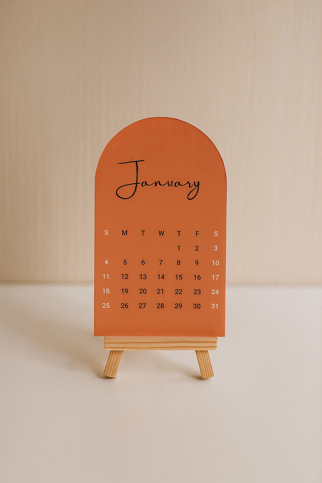 Our 2026 Easel Desk Calendar features beautifully designed arch-shaped monthly cards displayed on a premium wooden stand, a perfect blend of functionality and aesthetics for your workspace.